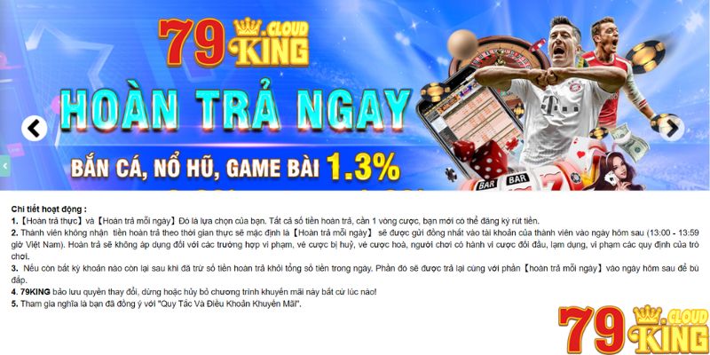 79King cam kết mang đến trải nghiệm giải trí tốt nhất cho người chơi, và một phần quan trọng của trải nghiệm đó chính là chương trình hoàn trả tức thời của nhà cái chúng tôi – Dịch vụ độc quyền không thời hạn.