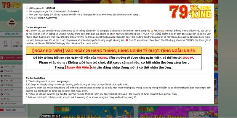 Một trong những chương trình đặc biệt của “Phát thưởng khuyến mãi giáng sinh 79king” là chương trình “Thưởng hội viên ngày 29”. Đối với ưu đãi thưởng hội viên ngày 29 hàng tháng, hệ thống sẽ phát thưởng lên đến hơn 1000 tỷ đồng trong ưu đãi giáng sinh.
